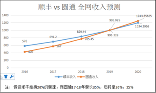 順豐全網(wǎng)收入份額一度達(dá)20%。但隨著增速落后逐年下滑,很可能要失去老大地位。圓通申通單票運(yùn)費(fèi)是順豐的1/2,只要件量是順豐的2倍。就有可能超過順豐。2016年2月圓通老板娘張小娟在杭州兩會上透露圓通2015年總件量約35億件(實際30億票),全網(wǎng)營收350億元(實際可能為300億元)。根據(jù)圓通發(fā)布的業(yè)績預(yù)告,2016年件量和收入都大于40%的增長。全網(wǎng)收入可能超420億元。假若保持這種趨勢下去,圓通甚至中通、申通等都可能在接下來三五年內(nèi)在全網(wǎng)收入上超越順豐, 甚至比順豐提早突破千億大關(guān)。順豐可能掉至三四名甚至更后。