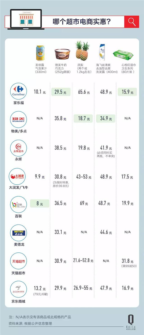從包裝食品、進(jìn)口食品、生鮮到日化產(chǎn)品,我們隨機(jī)選擇了五個產(chǎn)品比較了一下價(jià)格。天貓超市和京東的價(jià)格優(yōu)勢不是那么明顯了。天貓超市經(jīng)常會有提價(jià)再打折的情況(知乎有不少人也反映這種情況),比如心相印濕紙巾在天貓上雖然有滿 99 減 50 的折扣,但實(shí)際上它的原價(jià)就是這款產(chǎn)品最便宜的渠道——家樂福的兩倍。從隨機(jī)抽選的 5 個產(chǎn)品來看,家樂福和物美的價(jià)格比較吸引人。