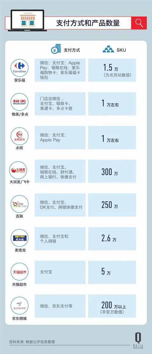 百聯(lián)電商和飛牛網(wǎng)更像京東商城或亞馬遜那樣的線上超市+百貨,SKU (據(jù)說)是百萬級別的。家樂福、麥德龍、永輝和物美/多點(diǎn)則更接近傳統(tǒng)意義上的大賣場超市,以食品和日化用品為主,SKU 在1~2 萬。