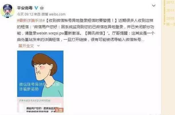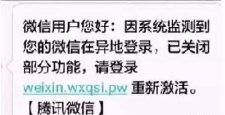 #最新詐騙手法#【收到微信帳號異地登錄短信時要警惕!】近期很多人收到這樣的短信:“微信用戶您好:因系統(tǒng)監(jiān)測到您的已微信在異地登錄,并已關(guān)閉部分功能,請登錄weixin.wxqsi.pw重新激活?!掘v訊微信】”。廳哥提醒:這其實是一個由偽基站發(fā)來的詐騙短信,一旦打開鏈接,很有可能被誘導(dǎo)輸入微信帳號、微信密碼、支付密碼、驗證碼等,后果不堪設(shè)想……