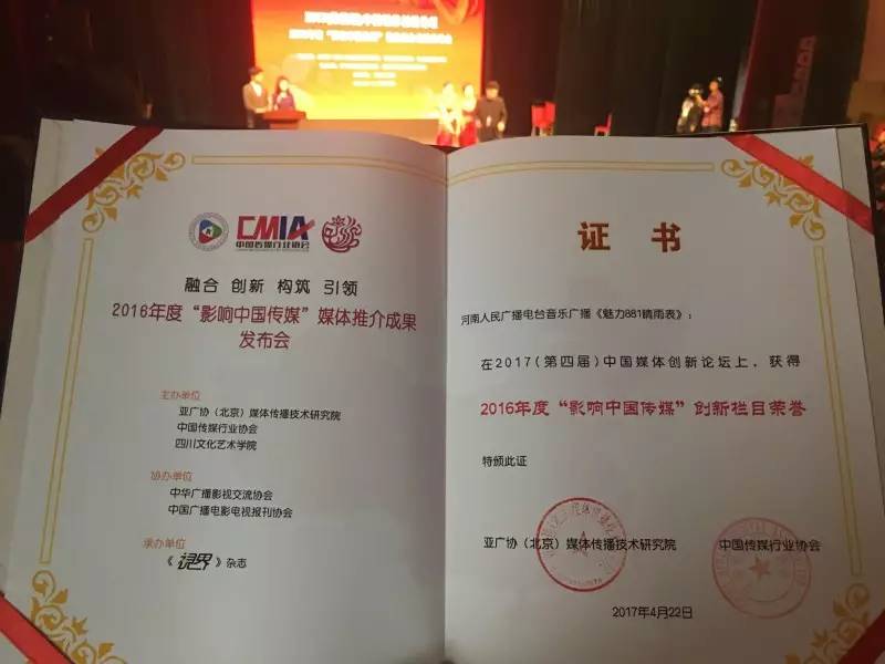我們魅力881河南音樂廣播獲得2016年度”影響中國(guó)傳媒“最具創(chuàng)新力媒體獎(jiǎng),《魅力881晴雨表》獲得2016年度“影響中國(guó)傳媒”創(chuàng)新欄目獎(jiǎng),DJ 陽(yáng)陽(yáng)出席論壇及典禮,與來(lái)自全國(guó)的媒體同仁進(jìn)行交流,分享廣播影視產(chǎn)業(yè)的寶貴經(jīng)驗(yàn)。