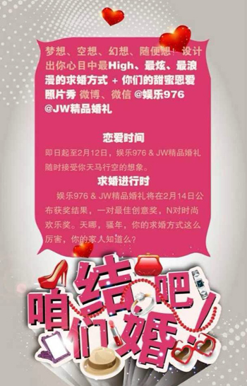 2月12日娛樂976全新上線,我們?yōu)槟蛟煲粓鰪V播史上最時尚最浪漫的求婚派對+結(jié)婚盛典!只要心中有愛,求婚方式可以多姿多彩,怎樣的求婚才能讓她難忘、心甘情愿說“I do!”?現(xiàn)在,只要有創(chuàng)意的求婚方式,就可以獲得10萬元求婚+結(jié)婚盛典!求婚,你準備好了嗎?咱們結(jié)婚吧!