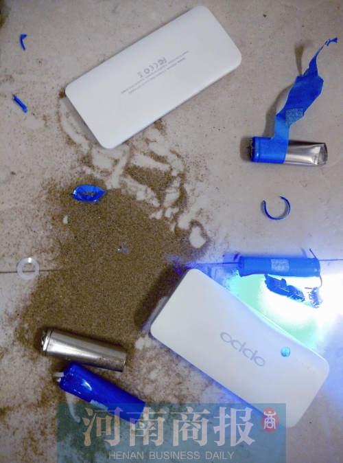 離開后,河南商報記者將充電寶拆開,看到充電寶中部分蓄電池與其他電池獨立分開,根本沒有導(dǎo)線,而沒有導(dǎo)線的電池里,裝滿了沙子?!皁ppo”充電寶中共有5節(jié)電池,有2節(jié)與電板通過導(dǎo)線相連,剩下光禿禿的3節(jié)電池“自成一派”。用錘子敲碎2節(jié),從電池里流出了細沙。
