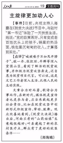 作為十九大的重要獻禮篇,《脫貧大決戰(zhàn)》第二季于10月11日正式播出。從第一季的“認識貧困、了解貧困”,到第二季的“幫扶貧困、解決貧困”,固本求新,展現(xiàn)扶貧工作的現(xiàn)實意義和顯著成效,彰顯河南在全國脫貧攻堅中的責任和擔當。節(jié)目播出之后,《光明日報》刊發(fā)《“土氣”背后的擔當精神——關于大型公益扶貧節(jié)目<脫貧大決戰(zhàn)>》?!度嗣袢請蟆钒l(fā)表評論《主旋律更加動人心》,稱贊《脫貧大決戰(zhàn)》是“深入生活、扎根人民的生動實踐”,國務院扶貧辦、中宣部、省委省政府、省委宣傳部等多個領導對節(jié)目給予充分肯定。